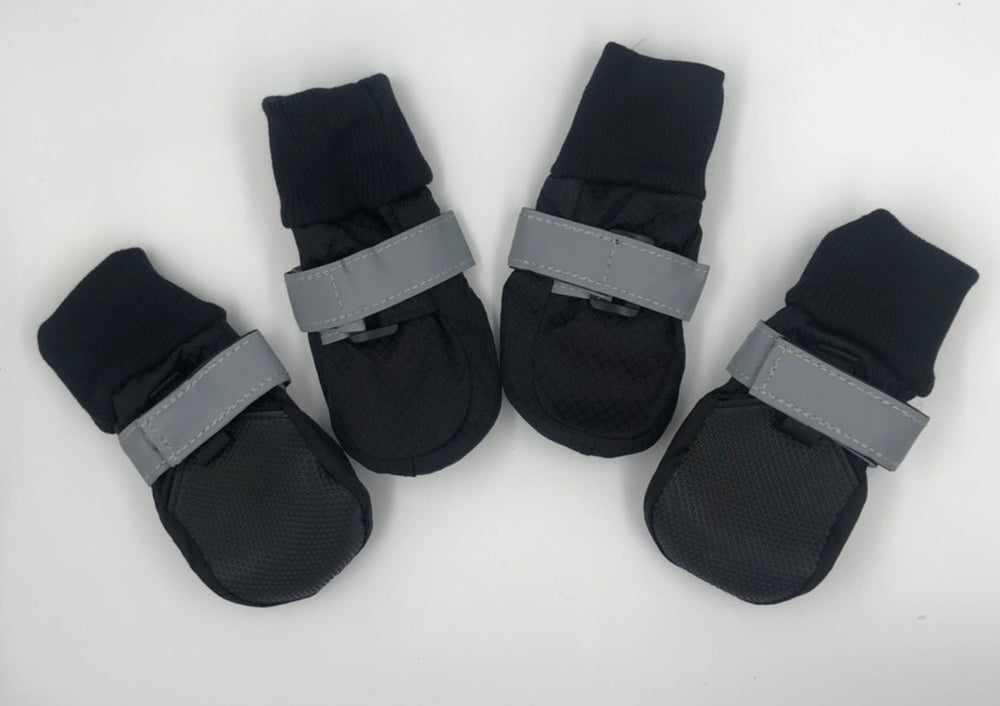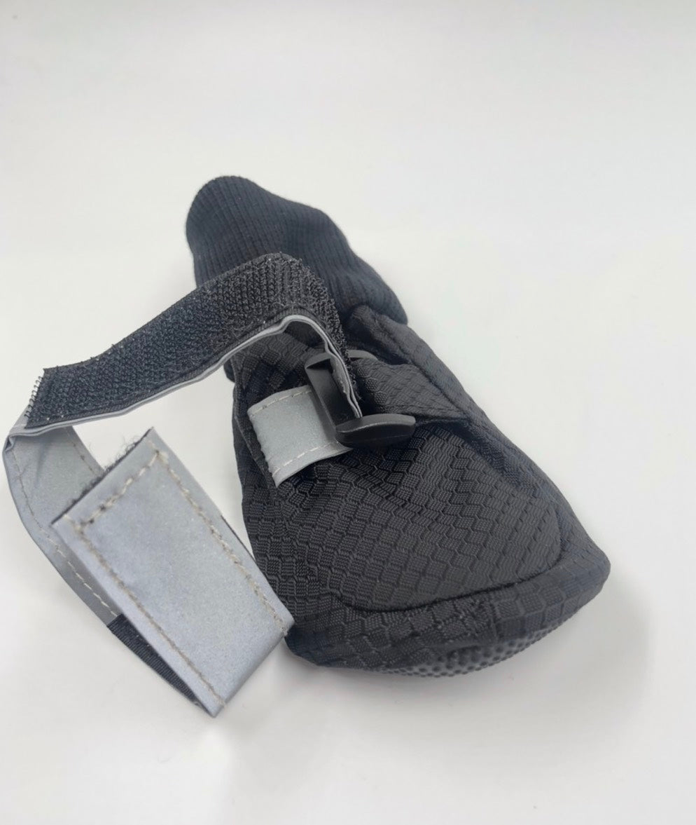 A comfortable and durable dog shoe that features a water resistant ripstop nylon outer and a fleece lining. A cotton cuff folds down easily to allow the shoe to be put on. Most importantly, the sole is a thick and textured rubber, meaning the shoe will be long lasting for even large and heavy dogs. A perfectly placed wide ankle strap has the vital cinch buckle at the front, allowing the strap to be pulled much tighter than you could manage wrapping it manually. There's also a thoughtful belt keeper in the back, meaning the strap will stay exactly at the ankle and not slide around - a cause of many lost shoes. The belt keeper is even anchored on the sole of the shoe (on all but XXL size) to prevent the strap from putting pressure on the fabric.